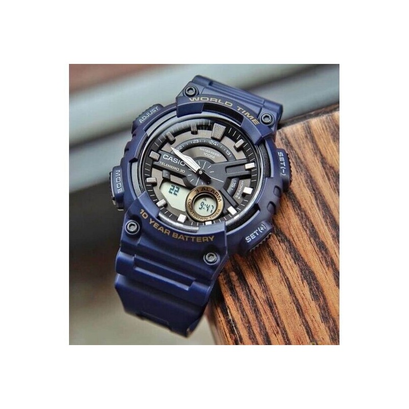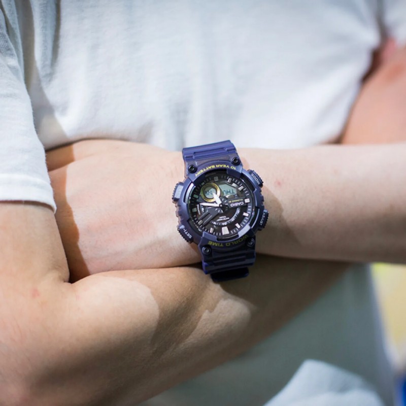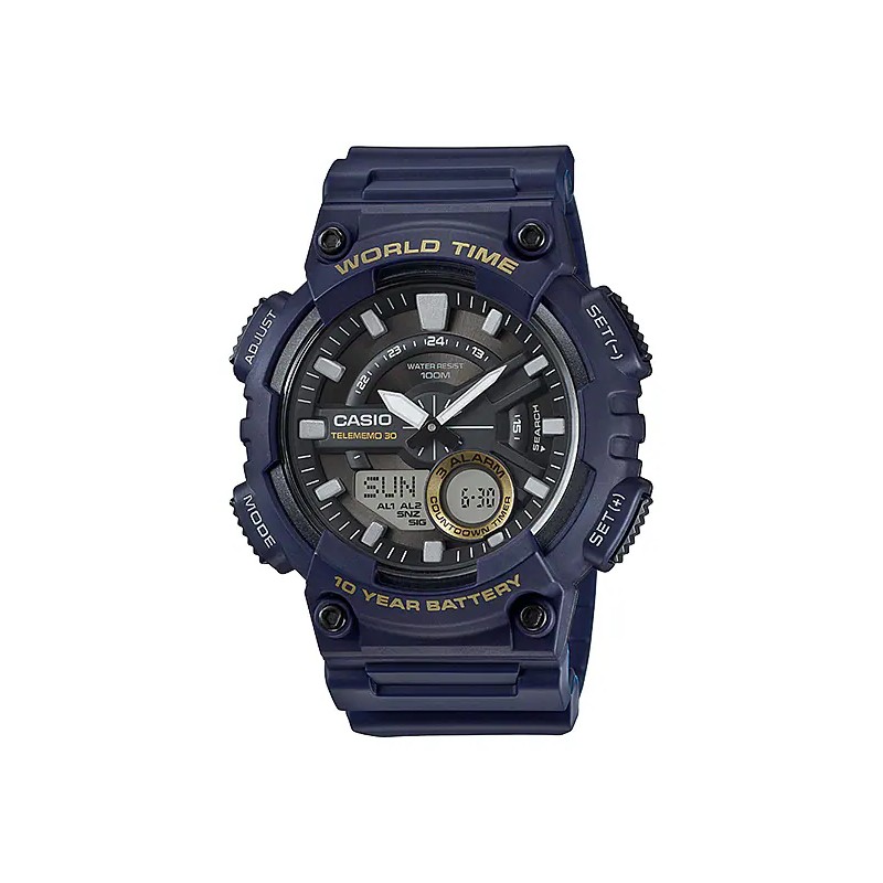 Reloj Casio Batería 10 años AEQ-110W-1AVEF ha sido fabricado en caja de resina y fondo de acero, y correa de resina, con cierre de tipo hebilla. Estamos ante un reloj analógico y digital, con manillas luminiscentes. Dispone de esfera negra con pantalla digital. Cuenta con una pila con una duración de 10 años. Asimismo, es sumergible hasta (100 metros), apto para nadar y snorkeling.